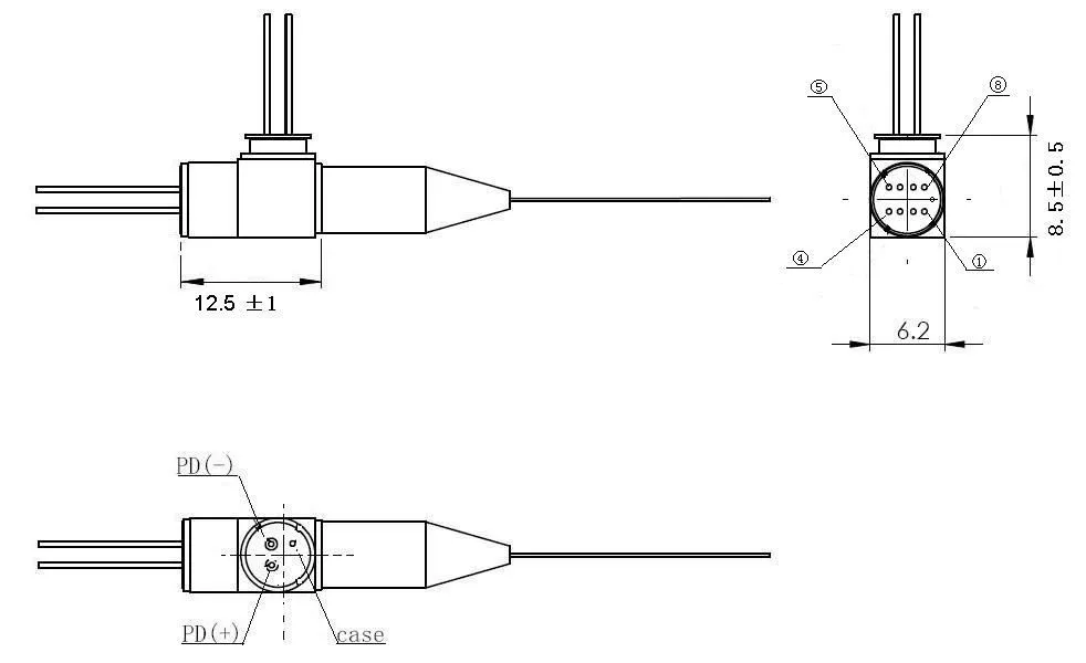 The BOSA is in coaxial package. The laser diode has 8 pins and the photo diode has 3 pins. For more information about pin configuration, please contact sales.