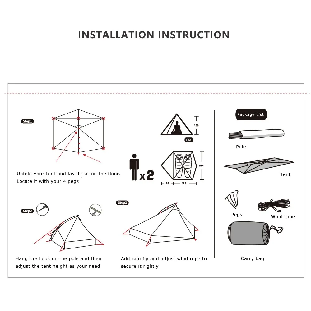 Packing List: 1* pole +1*tent+4 pegs+1*wind rope+1*carry bag