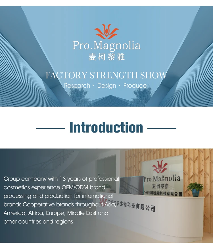 Founded in 2008, with 13 years' experience in OEM and ODM skin care products, Guangzhou Magnolia Cosmetics is a comprehensive enterprise combining development, design, manufacture and sales, owing individual factory and brand.