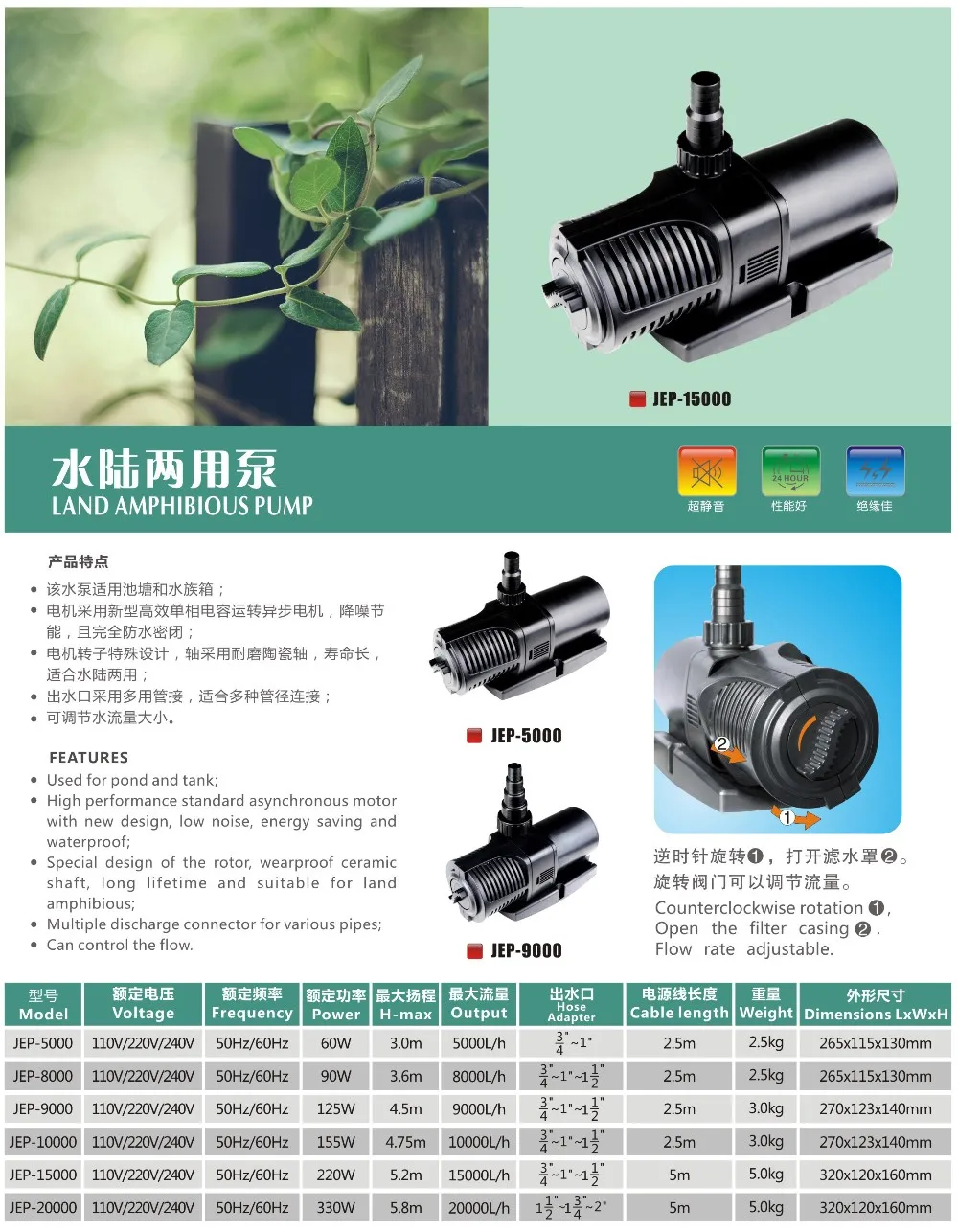 1. Novel design and generous, use the variable frequency technology;small power,large flow,high head, super silence and amphibious.