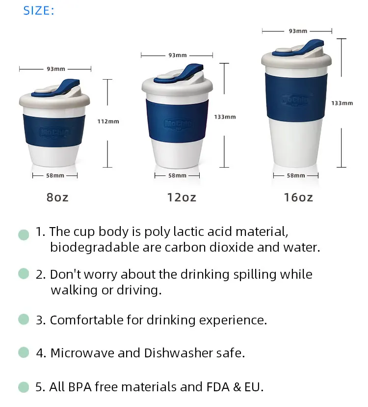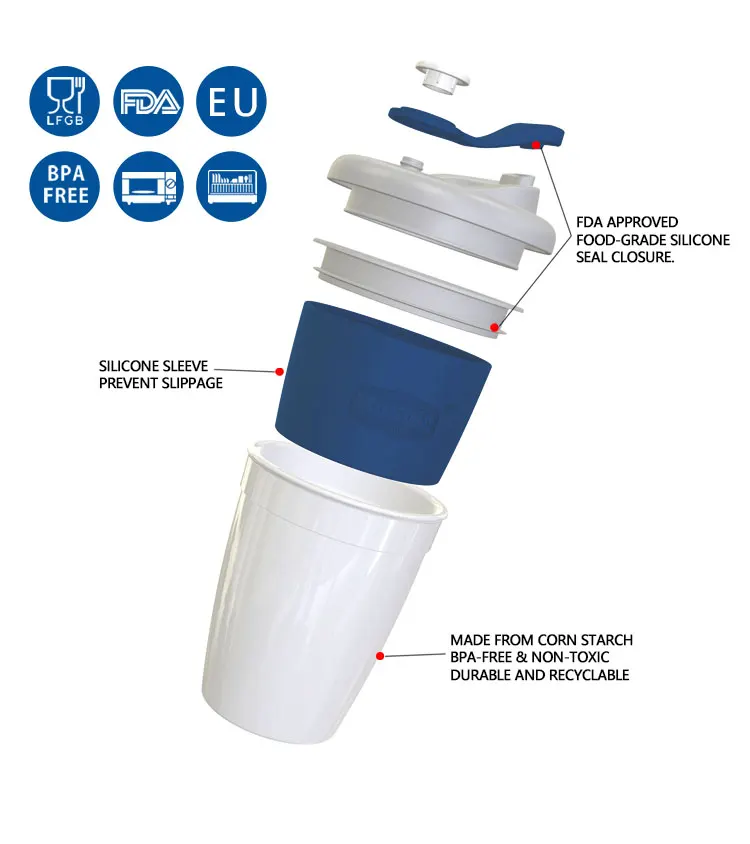 Features | 1.Part of cup can be Biodegradable. 2.Fashion and Easy to use. 3. Heat-Proof Silicone Sleeve 4. Spill-proof lid 5. All BPA free materials and EU 6. Microwave and Dishwasher safe. |