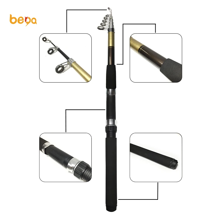 | Characteristic | 1. High quality fibrecarbon 2. Telescopic section spinning 3. Stainless steel guide with ceramic inserts smoothly cast retrieve line. 4. Non-slip handle comfortable and wear resistant. 5. Rein forced nylon reel seat strong, durable and lightweight. 6. Anti winding top, appear smoother, reduce damage to fishing line. 7. This series also features an all-new look including beautiful guides which provide maximum corrosion resistance and EVA handles.