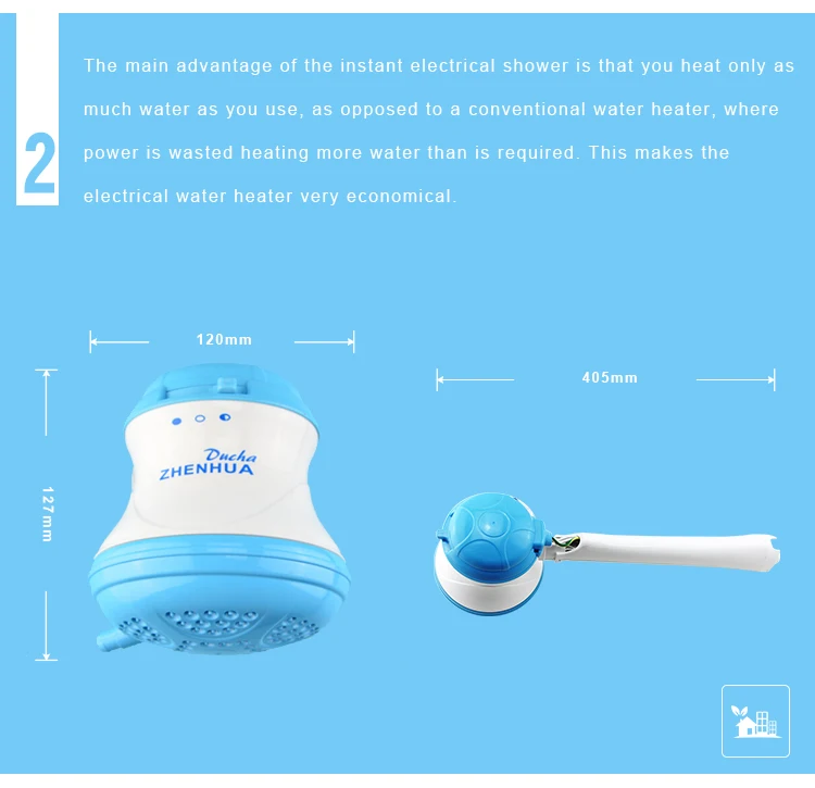 1.The main advantage of the electric shower head is that you heat only as much water as you use, as opposed to a conventional water heater, where power is wasted heating more water than is required. This makes the electrical water heater very economical.