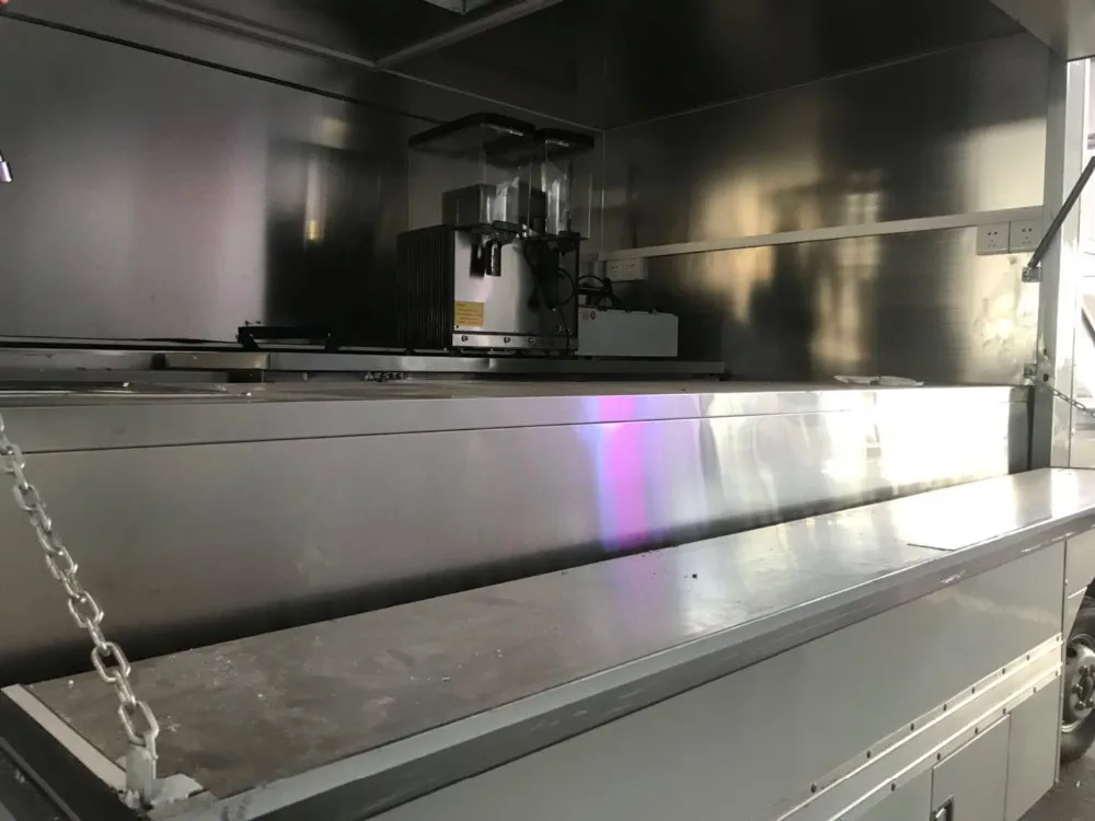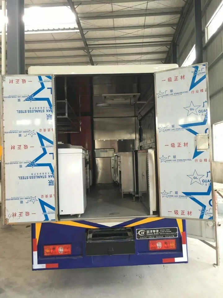 Standard Description1.The outside of van body is made of glass fiber reinforced material and inside is stainless steel material.The body floor made of skidproof , waterproof and wear-resistant aluminum checkered plate; 2.The top of the body is fixed with exhaust fan.And the left and right side and the back can be open and expanded and there is vending bar on both left and right side. 2.The top of the body is fixed with exhaust fan.And the left and right side and the back can be open and expanded and there is vending bar on both left and right side. 3.The internal van body is installed with the spotlight,,megaphone, master switch, USB interface, large space locker;The outside of the van body is installed two loudspeakers.Installed with 105A battery,different truck color and skin stickers are optional. | ||||||