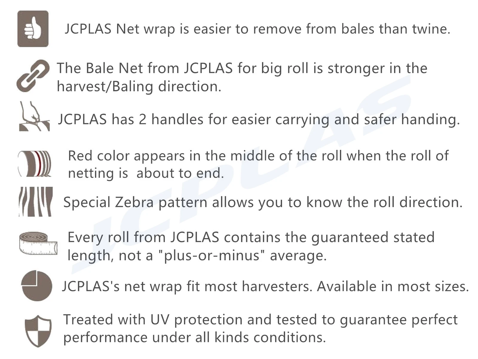 Baler netwrap is the leading netwrap and it has become the industry benchmark for PREMIUM netwrap. JCPLAS Baler Net wrap brings significant efficiencies to the baling operation and produces fully covered bales, consistently, so increasing crop and fodder values.