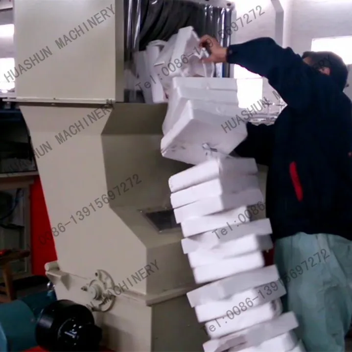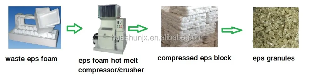 This EPS foam styrofoam hot melt crusher recycling machine for recycling waste expanded polystyrene foamed is mainly used to recycle waste eps foam, the finished eps block can be made eps granules for ps moulding raw material.