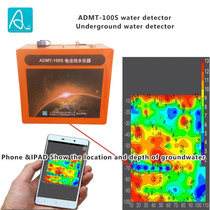 ADMT-100S is the Internet of Things instrument, which is developed together with Guilin Technology Hydro geological Investigation Institute. Based on over 40 years R&D design and exploration, the mobile phone portable underground water finder/detector realize the technology that you can use the mobile phone or tablet PC to do complex data calculation, then the graphs will automatic form, store in the cloud, and you can communicate with experts advisers on line about your graphs. Besides, if use our probes to measure, then you can wireless detect. It uses the mobile phone's Bluetooth to connect. And in the "MN input", you can use traditional MN cable lines or wireless sensor to measure. If with wireless sensor, you don't have to cabling and can just measure by walk and stop, free of USB disk, detection button. Automatically mapping by mobile phone, communicating with experts advisers online, uploading the data into cloud and store permanently.