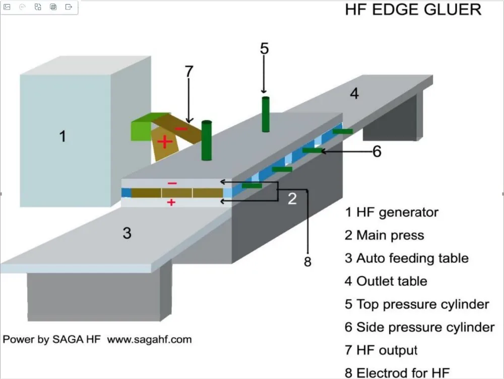 Place the glued wood slats into the feeding table, starts RF edge gluer, feeding cart will push the slats to the curing table, PLC gives signal to the hydraulic, top press plate presses down to make the wood slat flat and uniform, then back pusher pushes in to make the wood slats well glued, high frequency power starts automatically to heat the glue according to set time, after heating finish, pressure keep and HF stop, system starts the program of cooling, after cooling, back pusher move back, top plate raise, one cycle finish. When the second feeding starts, the finish panel or board is pushed out of curing table and fall to outlet table, then the second gluing cycle starts.