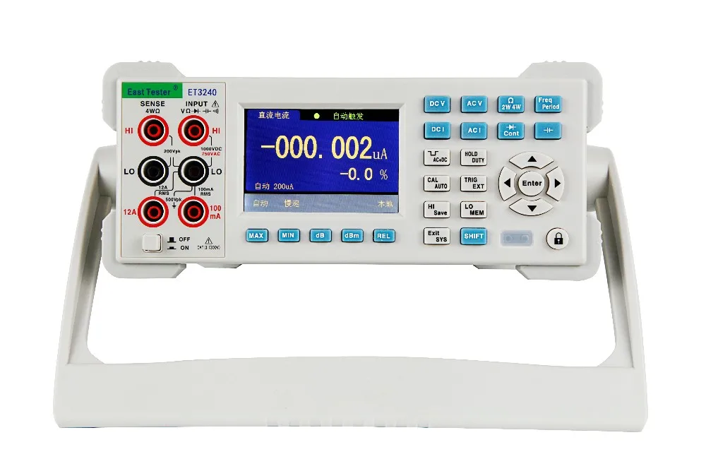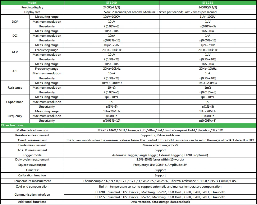 12 basic measurement functions: AC and DC voltage, AC and DC current, two-wire / four-wire resistance, period / frequency, diode, on-off test, capacitance, duty cycle.