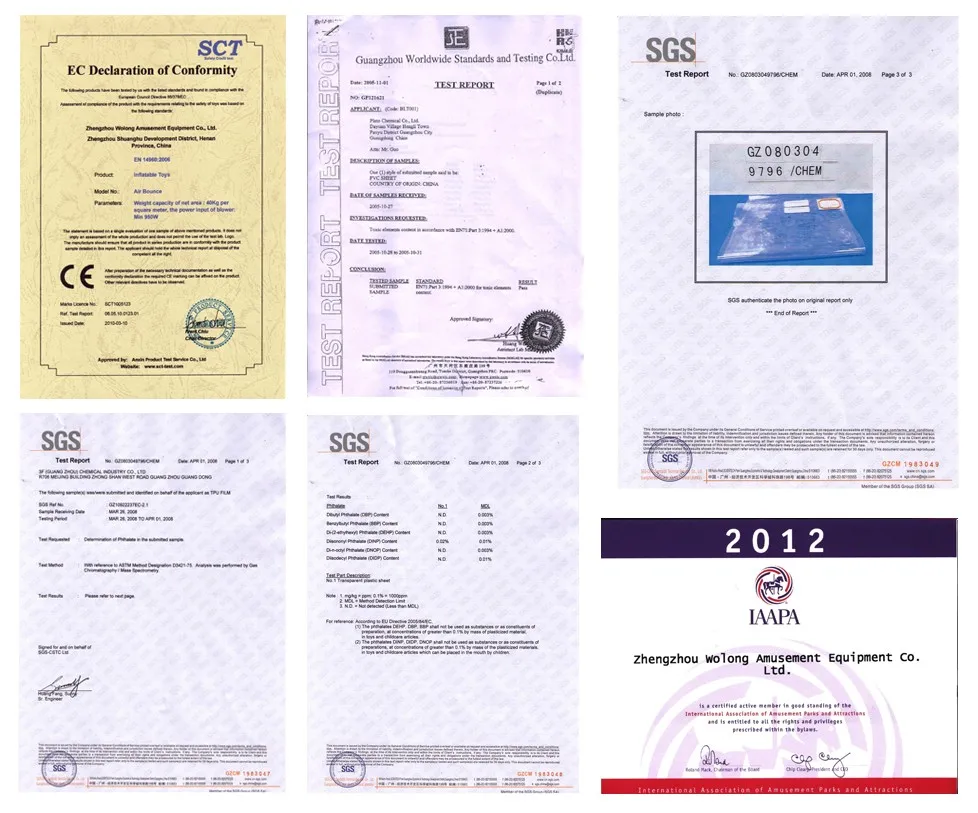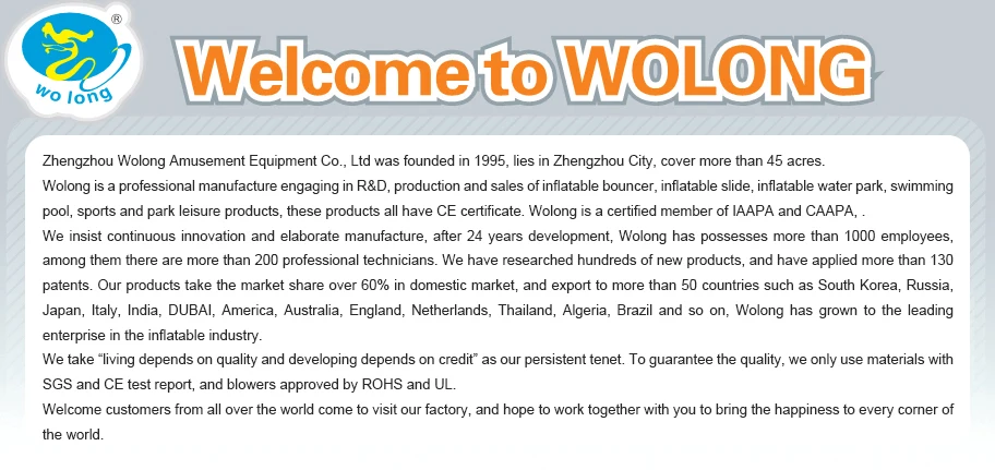 Zhengzhou Wolong Amusement Equipment Co.,Ltd was founded in1995, lies in Zhengzhou City, covers more than 40 acres. Wolong is a professional manufacturer engaging in R&D, production and sales of large inflatable toys, water sports and leisure products, inflatable advertising media products, which is a certified member of International Association of Amusement Parks & Attractions (IAAPA) and China Association of Amusement Parks & Attractions(CAAPA).