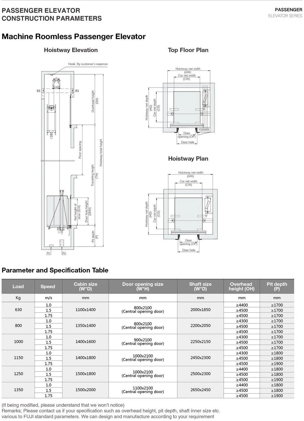 Load | Speed | Car Size | Door Opening Size | Shaft Size | Overhead Height | Pit Depth |