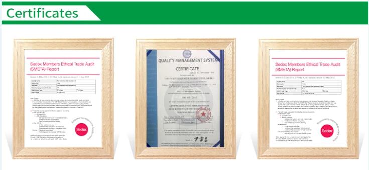 •Sedexregistered with a valid SMETA 4 pillar audit & SMETA 2 pillar audit &ISO 9001 certification.