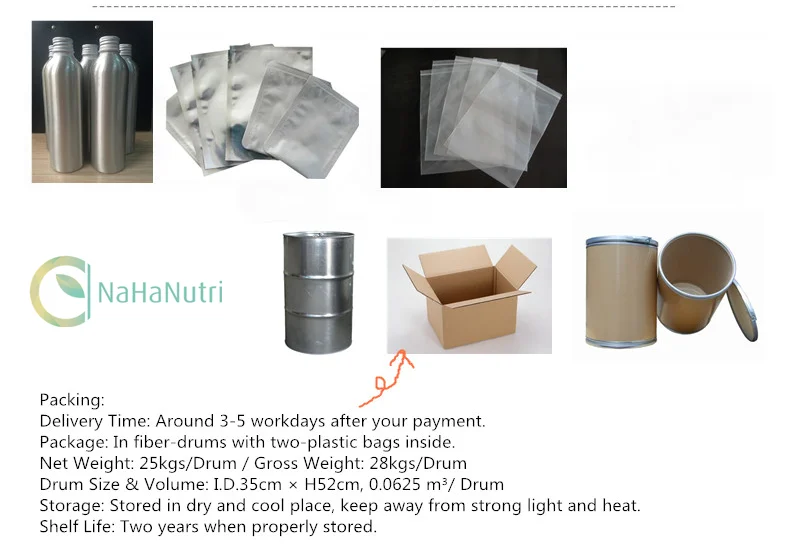 Packing: 1kg/bag, 25kgs/drum (Two plastic-bags inside and Paper-drums or per customer's requirements.)