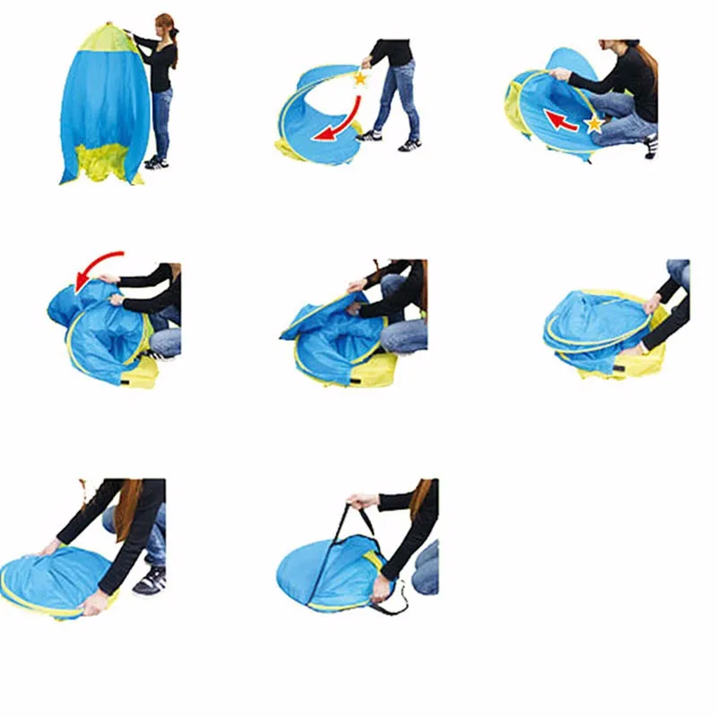 Feature | Extremely easy and swift to pop it up, just throw it into sky and it will open automatically. Come in a convenient handled carry bag for compact storage and easy transport. Tent pegs and pouches for holding sand for fixing under windy conditions. Special silver coated 190T polyester fabric, water-resistant and UV-resistant. Durable, useful tent for fishing, picnic or having beach fun. Function: waterproof, rainproof, windproof, anti-mosquito, UV protection | ||||