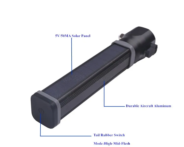 Lighting Distance: | T6:300m | Solar Panel: | 5V/50MA | |||