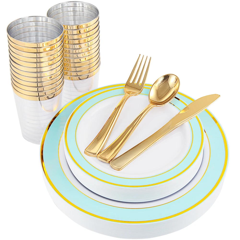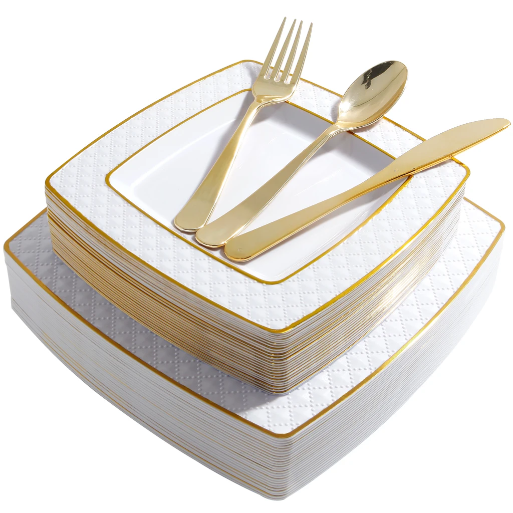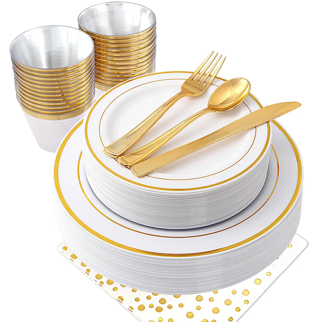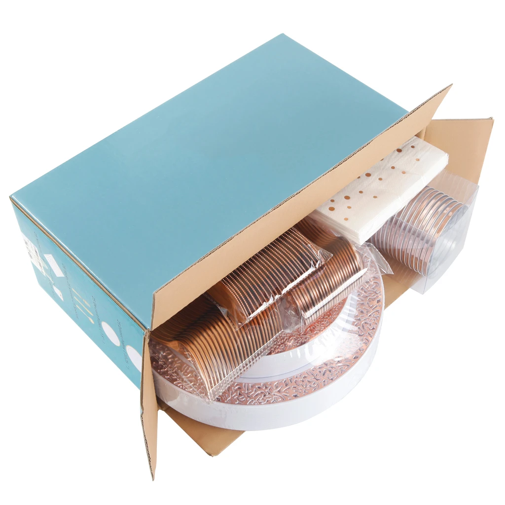 Packing: 25 plates(7.5inch), 25 plates(10.3inch), 25 cups, 25 forks, 25 napkins, 25 knives, 25 spoons. 175pcs/box,4boxes/ctn Box size: 37*14*26.5cm Carton size: 58.5*39*28.5cm | ||||||||||
