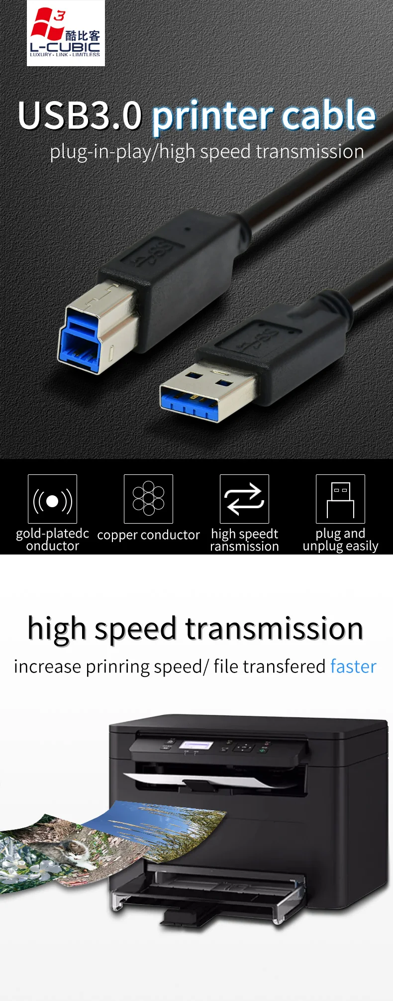 L-CUBIC High quality China supplier various lengths USB 3.0 AM to BM Cable USB 3.0 Printer Cable For USB 3.0 device | Black/White | 0.5m/1m/1.5m/2m/3m/5m | PVC | Copper |