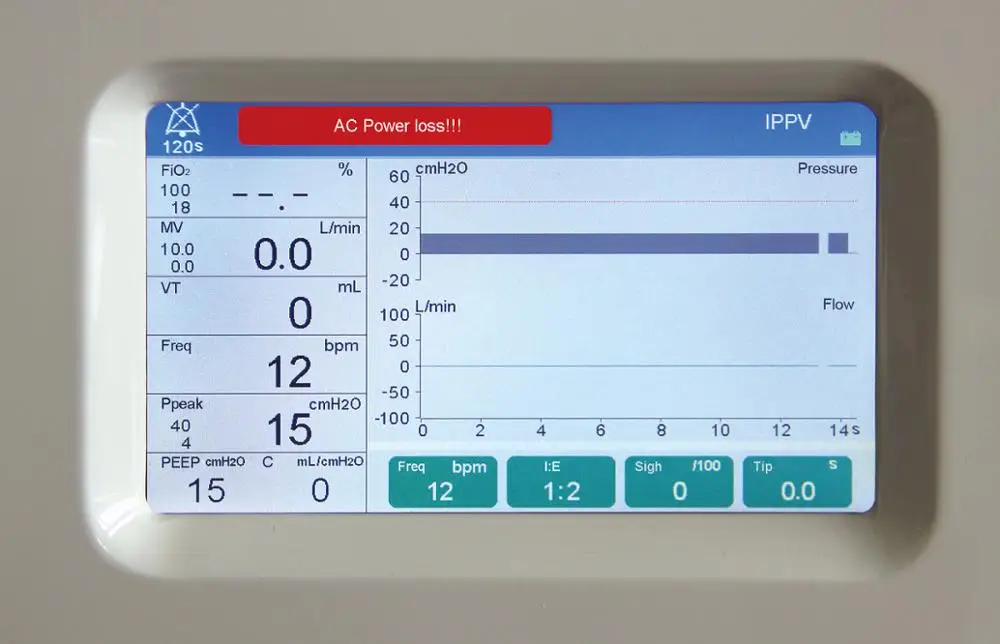 7" TFT LCD screen displays the Ventilation parameters, Alarming information and Waveform.