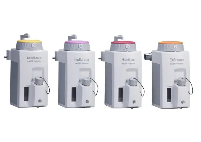 One vaporizers for standard, 2-3 for optional. Halothane, Enflurane, Isoflurane, Sevoflurane for choice.