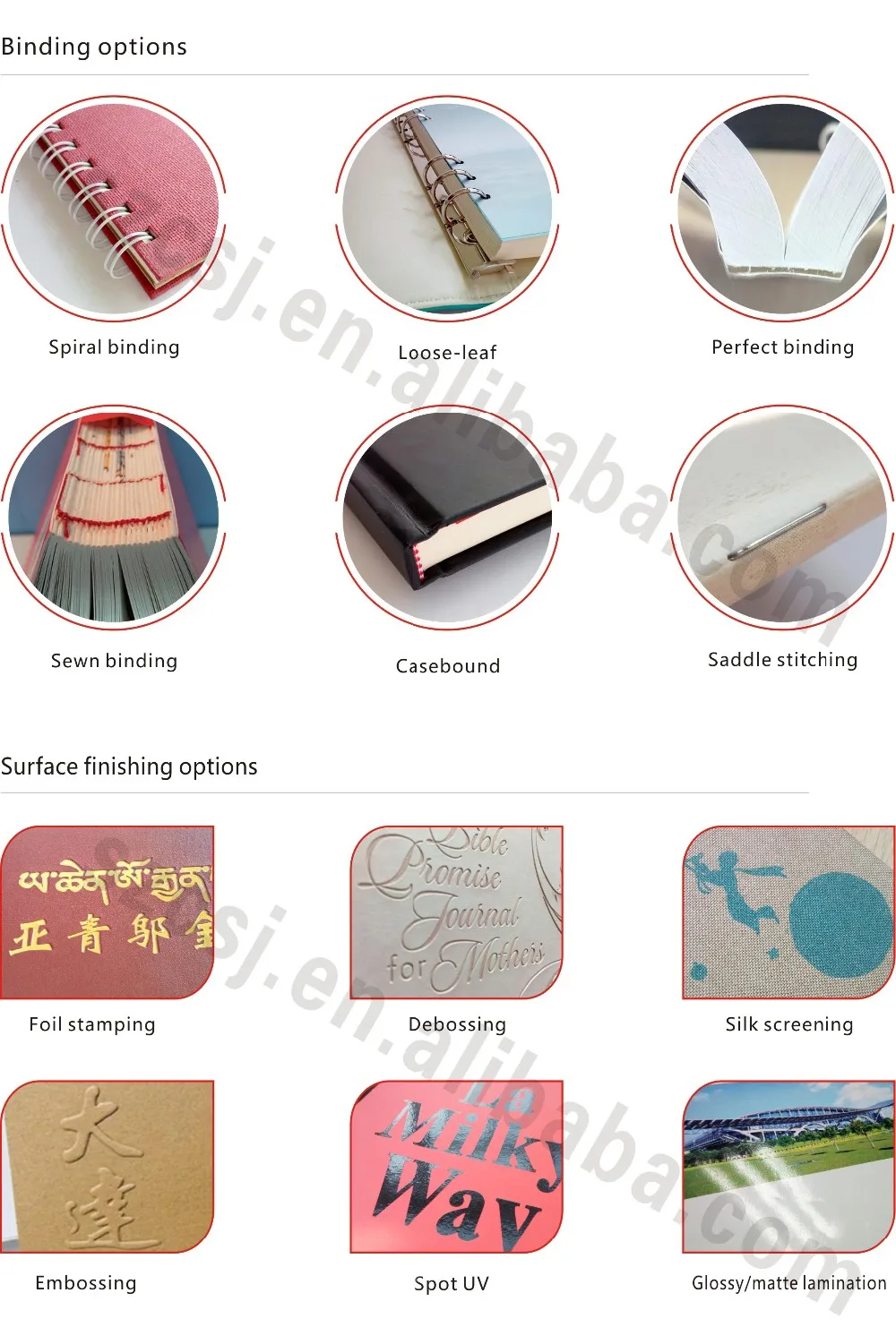 | 5. Binding: | Casebound,sewn binding,perfect binding,loose-leaf binding,spiral binding,saddle stitching |