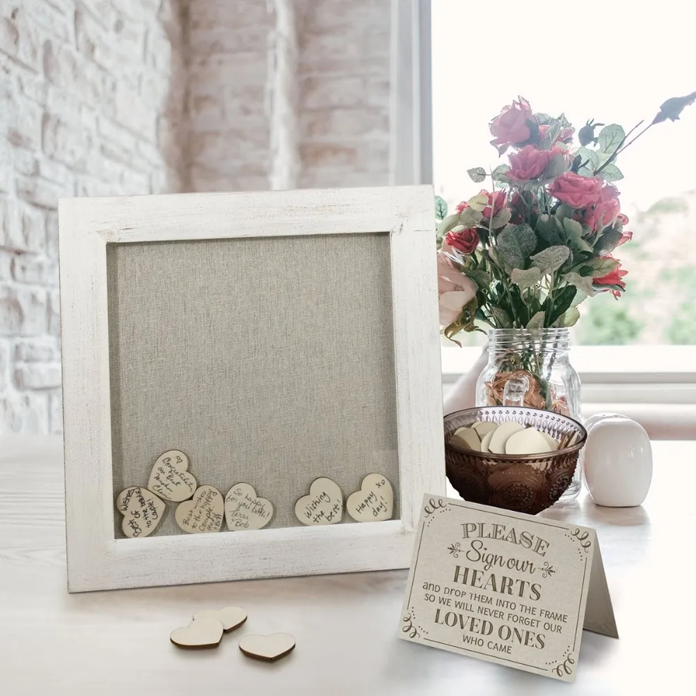 Come with nice stand. Convenient to put on desk. A beautiful big wood heart to make a unique Guest book.Comes with 85pcs cherry wood hearts 1.5" x 1.5" and 2 3" x 3"