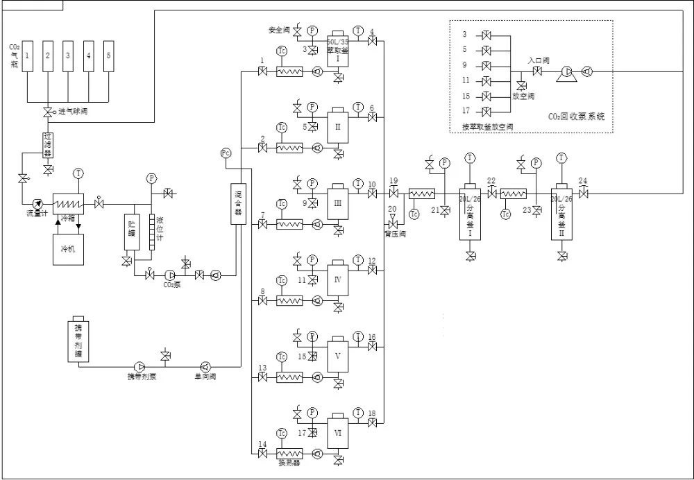 11 | Security Protection Device | a.High pressure pump outlet connects with electric contact pressure gauge, set working pressure, over-pressure automatic stop pump for protection. b.According to the max operation pressure of extractor, separator, storage tank, matched with safety valve, over-pressure automatic decompression device for protection. |