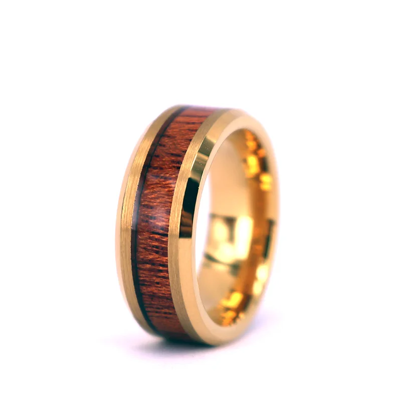 Tungsten Ring Yellow Gold Wood Inlay Wedding Band,8mm Polished Hawaiian Koa Wood Tungsten Band Ring