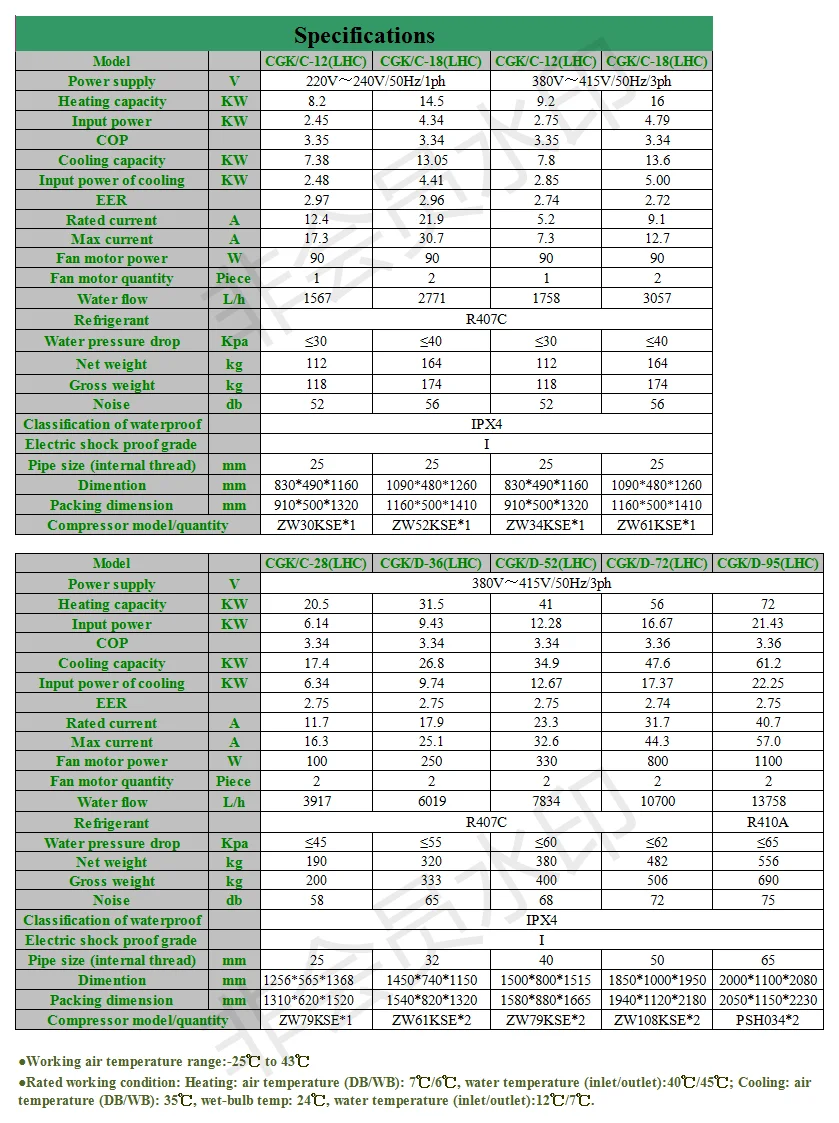 Rated Working Condition: dry bulb temp: 20℃, wet-bulb temp: 15℃, cool water temp: 15℃; hot water temp: 55℃.
