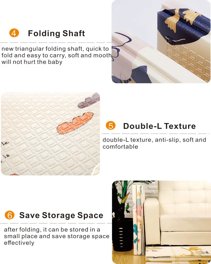 Features | 【BPA FREE & NON TOXIC】 The BPA free mat can decrease the hazard of baby's health and brain development, provides a safe place to play. CE and EN71 certification approved. 【 FOLDING & REVERSIBLE】 The super-easy-to-fold mat can be packed into compact size with a FREE carry bag, don't take up much space to store. Features reversible scene means buying one but getting two options for use. 【WATERPROOF& NON-SLIP】 The surface is 100% water-resistant and easy to wipe up inevitable spillages with a dry cloth, never worry about stains or cleaning issue. Double L textured design helps to reduce slipping and sliding. 【SOFT & LIGHTWEIGHT】 High density foam material reduces the impact and noise effectively. Soft and comfortable touch is more appropriate for baby's crawling and playtime. lightweight design is perfect to take it along to the beach, the park or anywhere! |