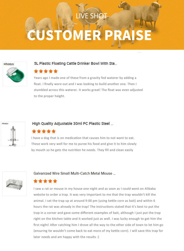 1、Are you a factory or trading company? We are a professional manufacturer. 2、Can you make products with our brand? Surely,we are welcome to cooperate as customized service. 3、May I get a Cheaper price? Cheaper price available if your quantity large . 4、What's kind of process and finishing treatment can you produce ? We are specializing in the veterinary instrument such as syringes,needles, emasculator, water drinkers, ear tags, pliers, etc. We have enclosed our catalog, whichintroduces our company in detail and covers the main products we supply at present. You may also visit ouronline company introduction at www.sxkd.com.cn which includes our latest product line. |