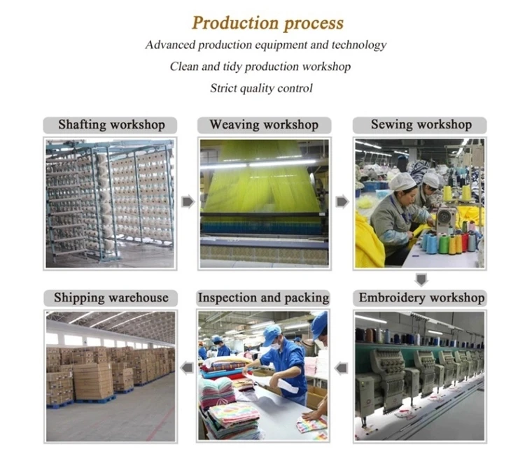 Our factory is mainly order-type production products are: Wet towel,bath towel, child towel, square,worship towel, terry cloth; Gift towels, labor insurance towels, kitchen towels, creative towels, advertising towels, gifts towels and other towel varieties; We value most on the reputation of client and our company, so we start controlling Towel quality from the yarn to dyeing process, after-finish process and final inspection.
