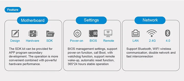 Comply with EMC anti-electromagnetic interference standard, support power on, 365x24 hours stable operation, does not crash, has a watchdog function, supports remote wake-up, automatic reset.