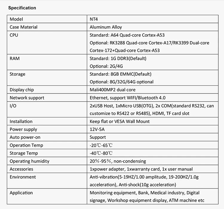 * Storage: 8GB EMMC(Default), up to 8G/32G/64G optional