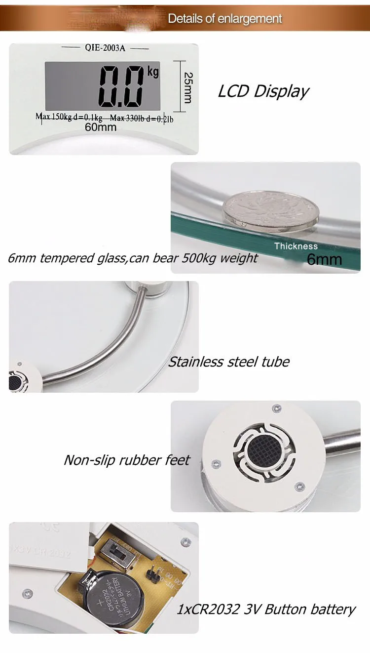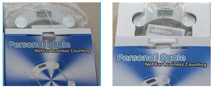 Feature | 1) 300x300x6mm tempered glass platform 2) Capacity: 180kg/396lbs 3) Division: d=0.1kg/0.2lb 4) Indicator: 4 digits in LCD display 5) Automatic zero resetting 6) Turn off after 8 seconds 7) Power source: 1 * CR2032 Li-ion battery 8) Overload and low battery indicator |