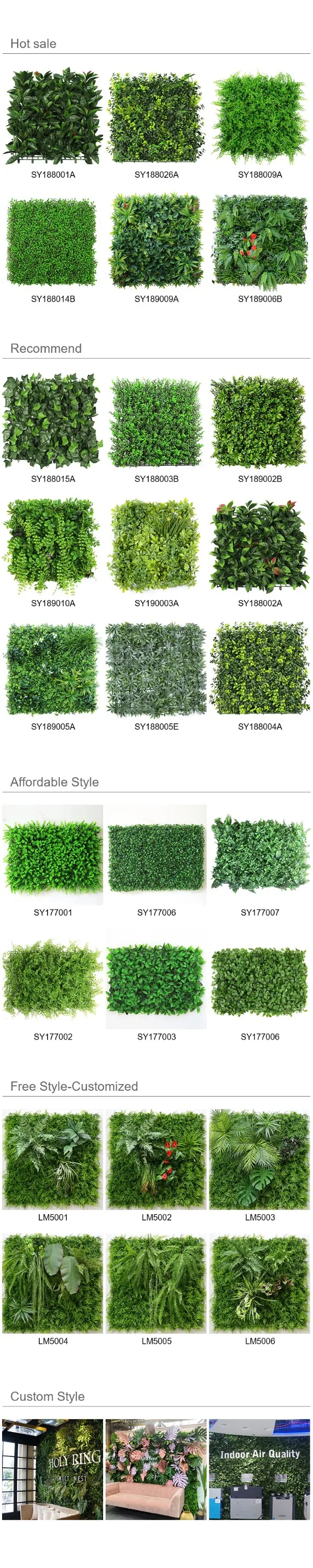 The company's sales & marketing center is located in Shanghai and the manufacturing center is located in Zhejiang Province with a 50000m2 factory that possesses 20 cutting-edge production line. The factory is manufacturing more than 200 products, adding up to 5 million square meters in area per year. The main products are artificial plant walls, artificial flower walls, artificial turf and indoor and outdoor decorative plants and flowers. Products are mainly sold to: Europe, North America, South America, Africa, Southeast Asia and other regions. We have been in this industry for 8 years. Companies adhering to the "natural harmony, focus on innovation" business philosophy, carefully create high-quality environmentally friendly products for you, provide the best service, work together with you on the road to create more surprises for you!