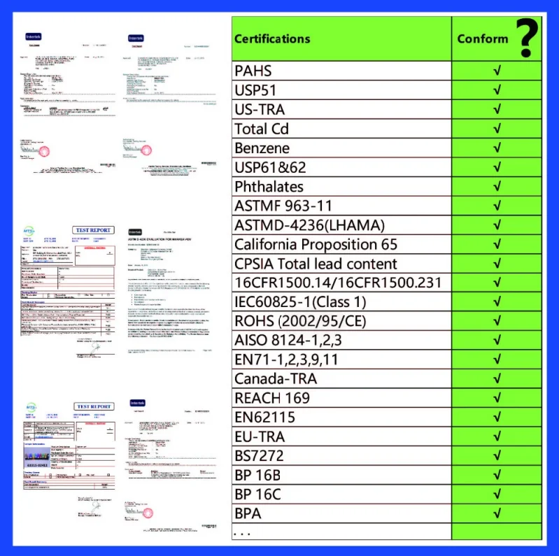 All products conform to ASTMD-4236, EN71, REACH, TRA, BS7272, Phthalate,USP51