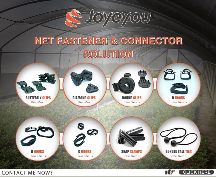 - Ideal for Connect net and fabrics on the wire on the top - Made of injection mold with our own mould - With UV resistance to atrocious weather for lasting durability - High bite force to ensure safety of net - Ideal for anti-hail net, shade net , anti-bird net etc - Easy to install on netting selvage - Circle, triangle, butterfly-shaped available - Customers' special order is available |