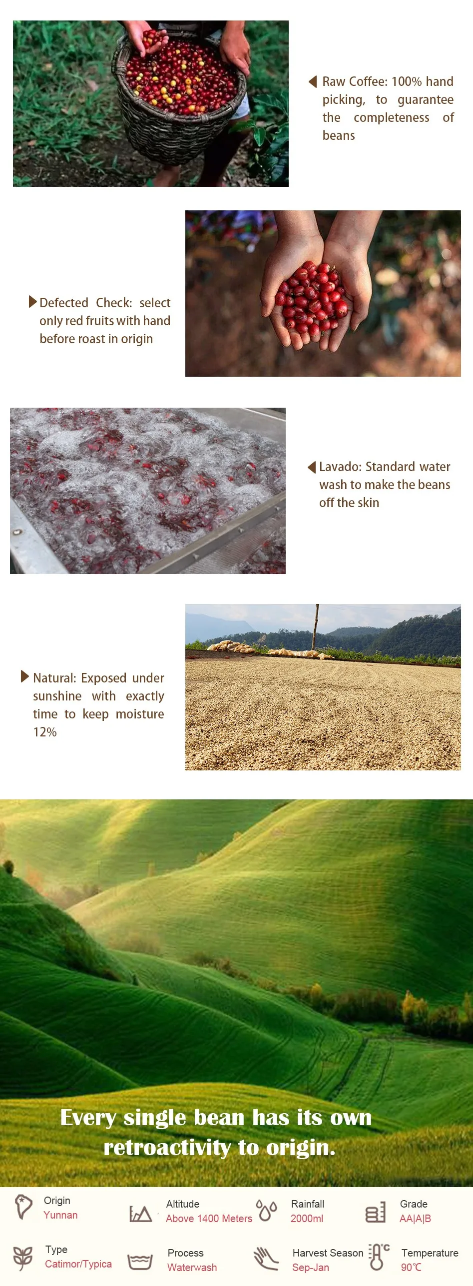 AA grade green beans from high altitude areas of Yunnan Province, the unique climate gives it a richer taste, the washing process retains its original taste.
