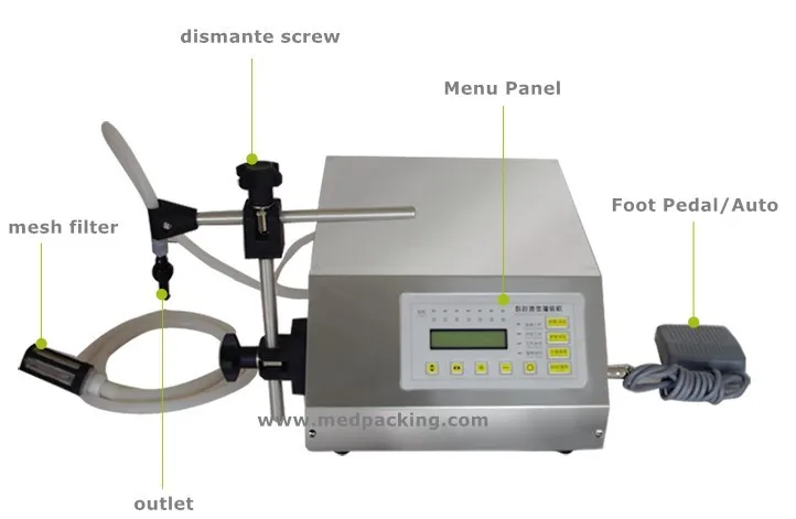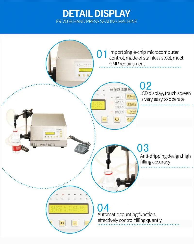 Anti-drip setting of the discharge port, humanized design, durable, high filling accuracy and accurate measurement. Equipped with a new LED control panel, computer control, simple operation, more accurate operation. The model is small, the design is reasonable, and the work efficiency is fast and stable.
