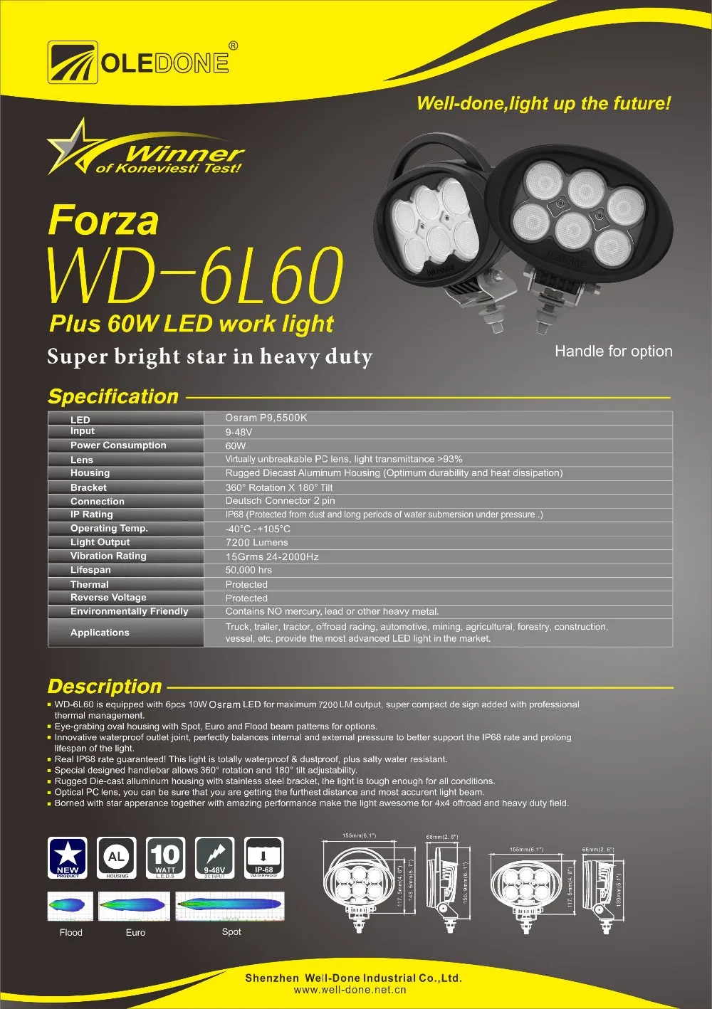 WD-6L60 is equipped with 6pcs 10W 0sram LED for maximum 7200LM output.