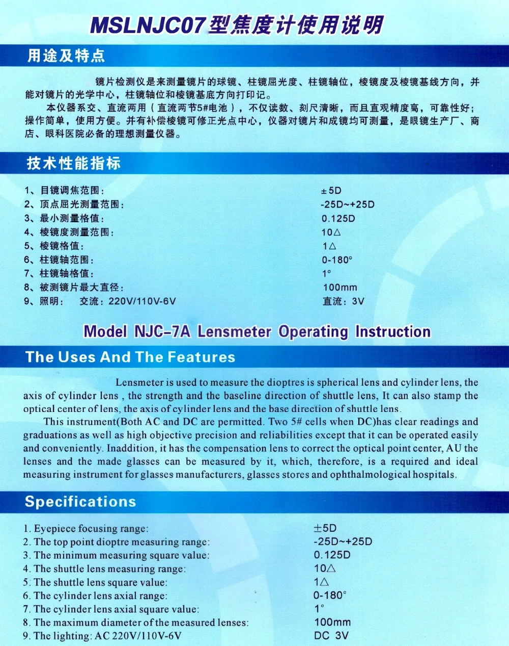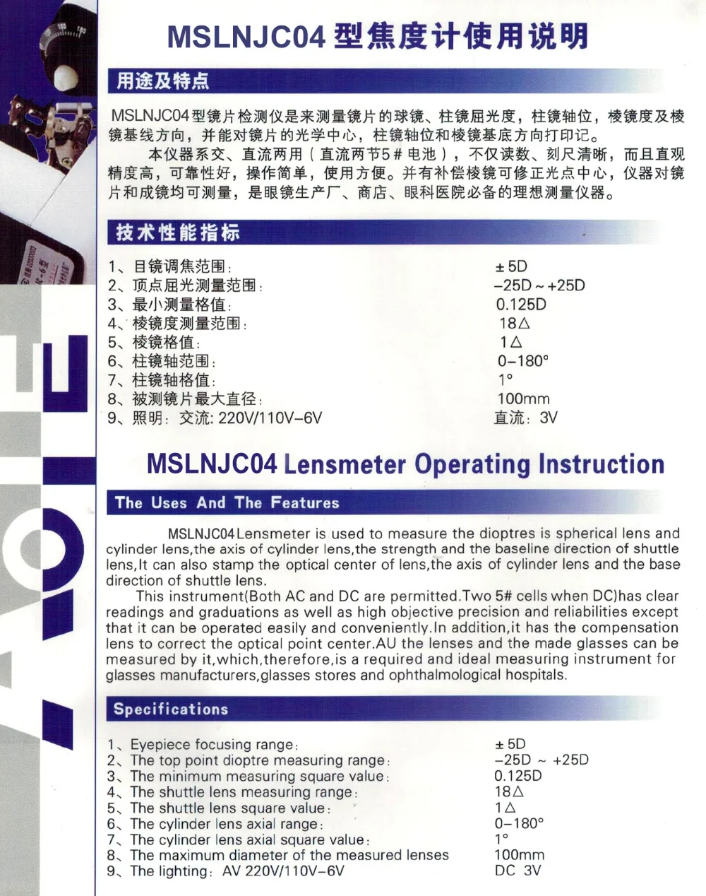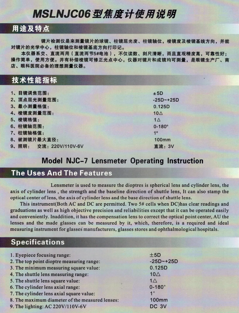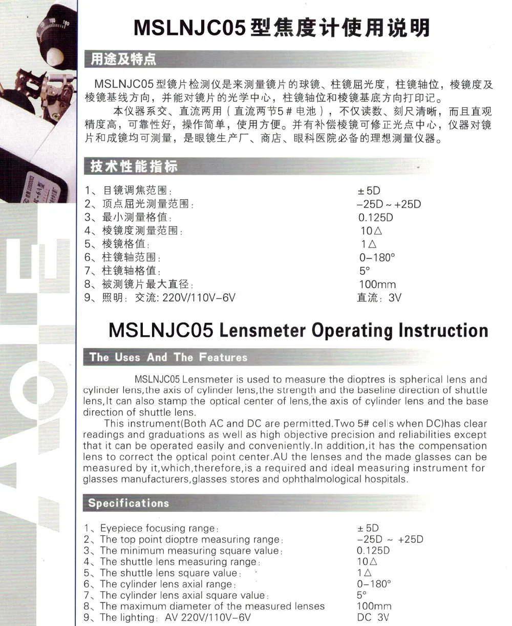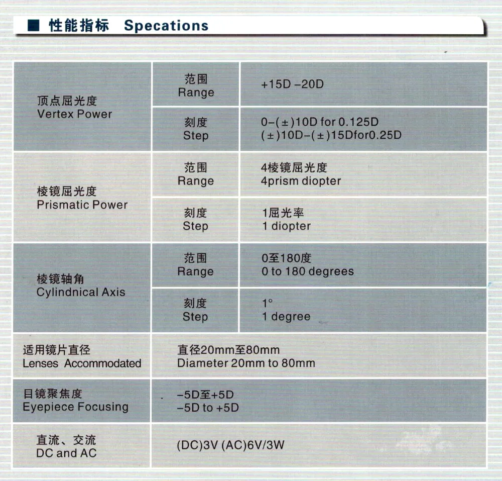 Prism degree | 0~5Δ Minimum scale value 1Δ with prism compensation device 0~20Δ Minimum scale value 1Δ | |
