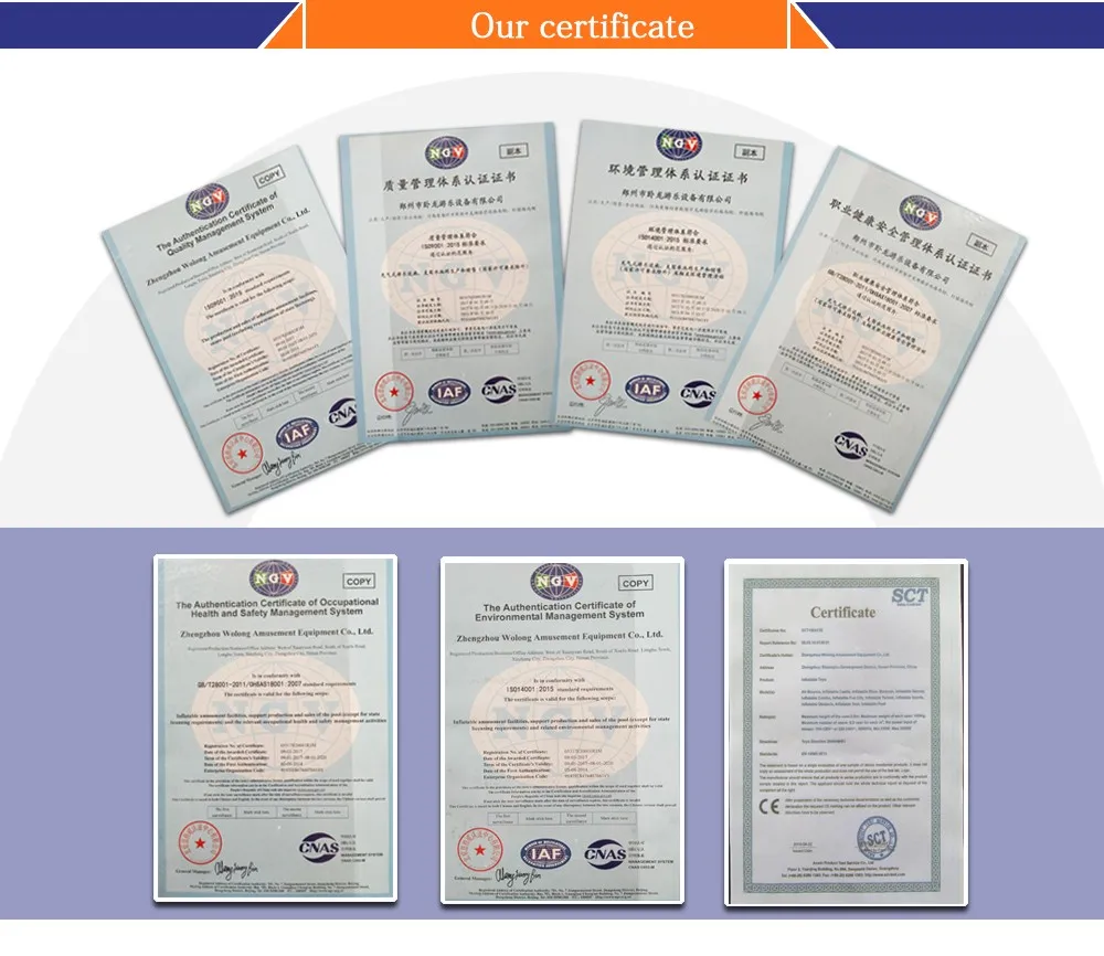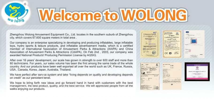 Zhengzhou Wolong Amusement Equipment Co.,Ltd was founded in1995, lies in Zhengzhou City, covers more than 40 acres. Wolong is a professional manufacturer engaging in R&D, production and sales of large inflatable toys, water sports and leisure products, inflatable advertising media products, which is a certified member of International Association of Amusement Parks & Attractions (IAAPA) and China Association of Amusement Parks & Attractions(CAAPA).