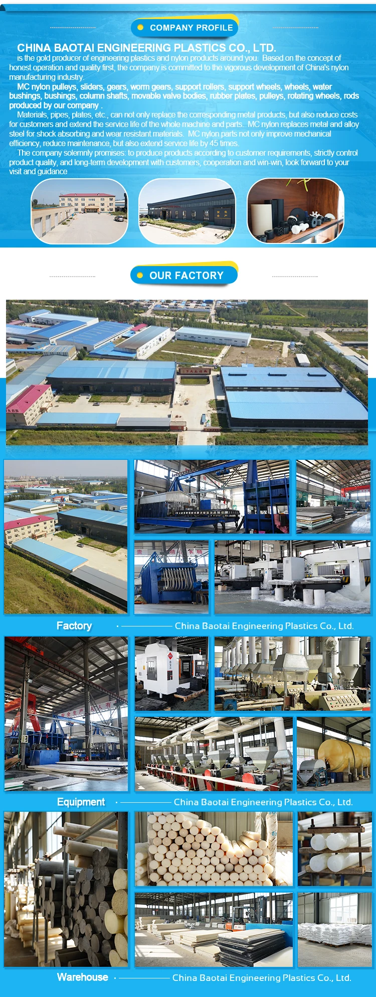 China baotai engineering plastics co., LTD is a gold manufacturer of engineering plastics and nylon products around you.The company in good faith management, quality first concept, committed to the rapid development of China's nylon manufacturing industry, to meet customer demand for nylon products, to provide customized services and products.