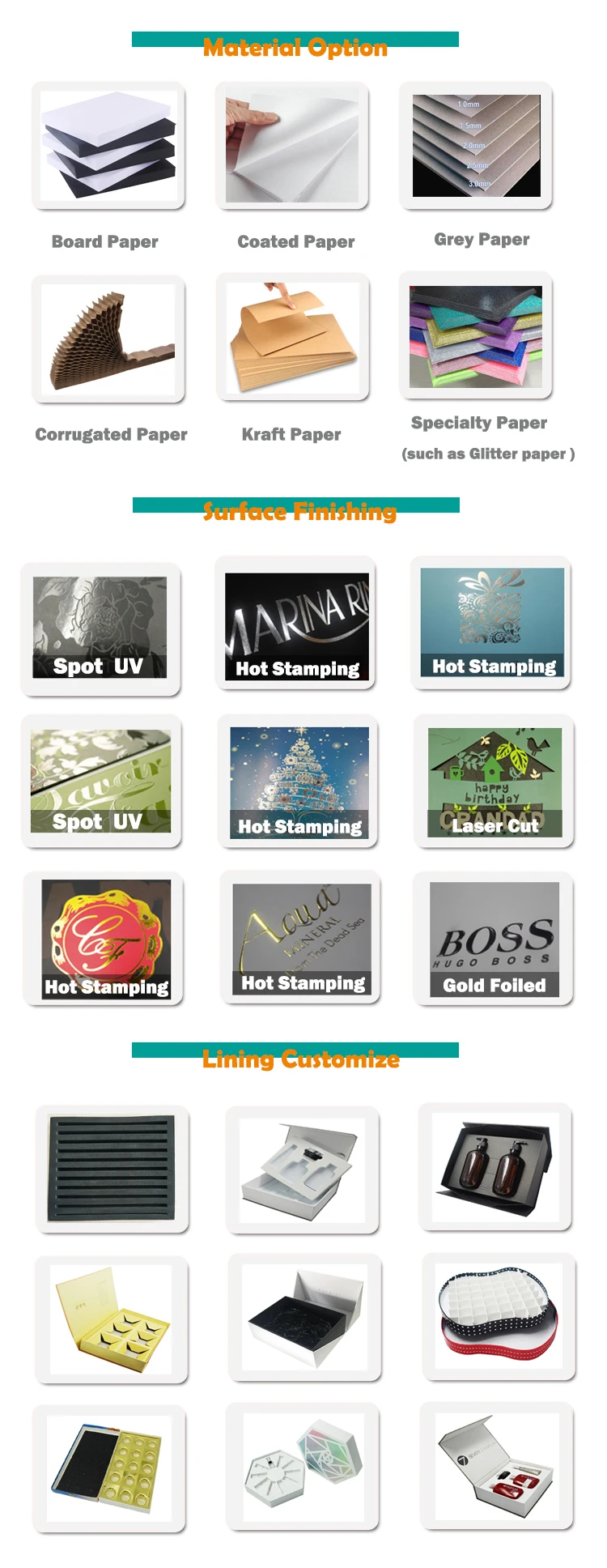 Surface Finishing | Glossy/ Matte Lamination, Vanishing, Aqueous Coating, Flocking, Gold / Silver hot stamping (foil), Debossed/Embossing,Texture,Spot UV as Following Pictures and Videos. | |||||||