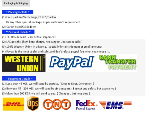 A: When you quote, we will confirm with you the trading method, FOB, CIF, CNF or other methods. In mass production, we usually pay 30% advance payment first, then see the balance of the bill of lading. Most of the payment methods are T/T, of course, L/C is also acceptable.