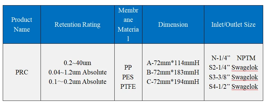 Retention ratings | PP:0.2, 0.25, 0.45, 0.8, 2, 5, 10, 20, 40um PES:0.04, 0.1, 0.2, 0.45, 1.2um Absolute PTFE:0.1,0.2um Absolute |