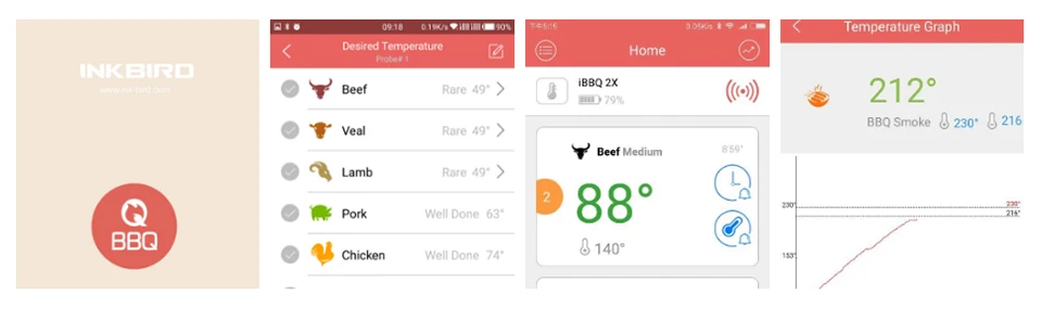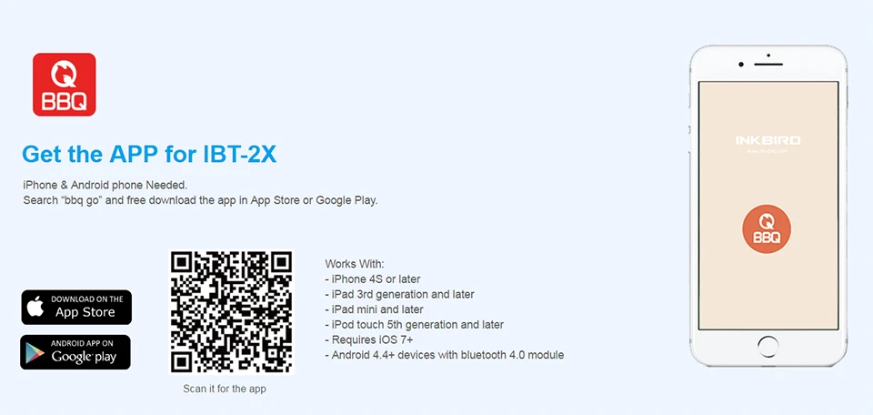 【Blue tooth Application】Blue tooth 5.0, compatible: Android (4.4 + top), iOS 7+ devices. Download and install " BBQ GO" APP, connect to your phone via Bluetooth, set the target temps and time, then it works.