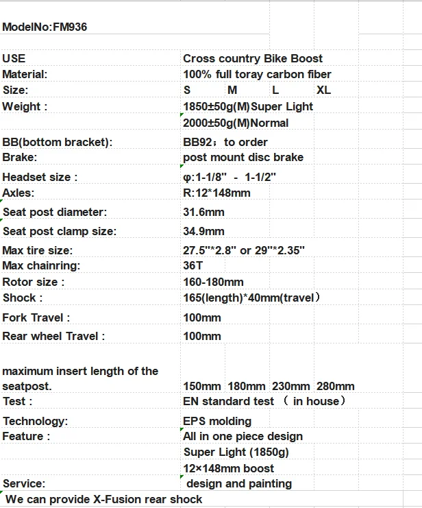 Carbonda FM936 29er / 27.5 full suspension Cross country mountain bike frame Bike Boost