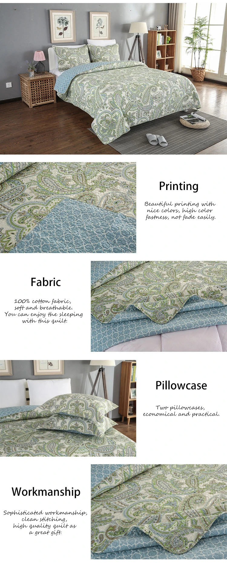 Description | Printed Chinese Brake Herb Cotton Fabric Quilted Bedspread | ||||
