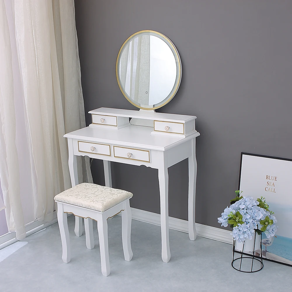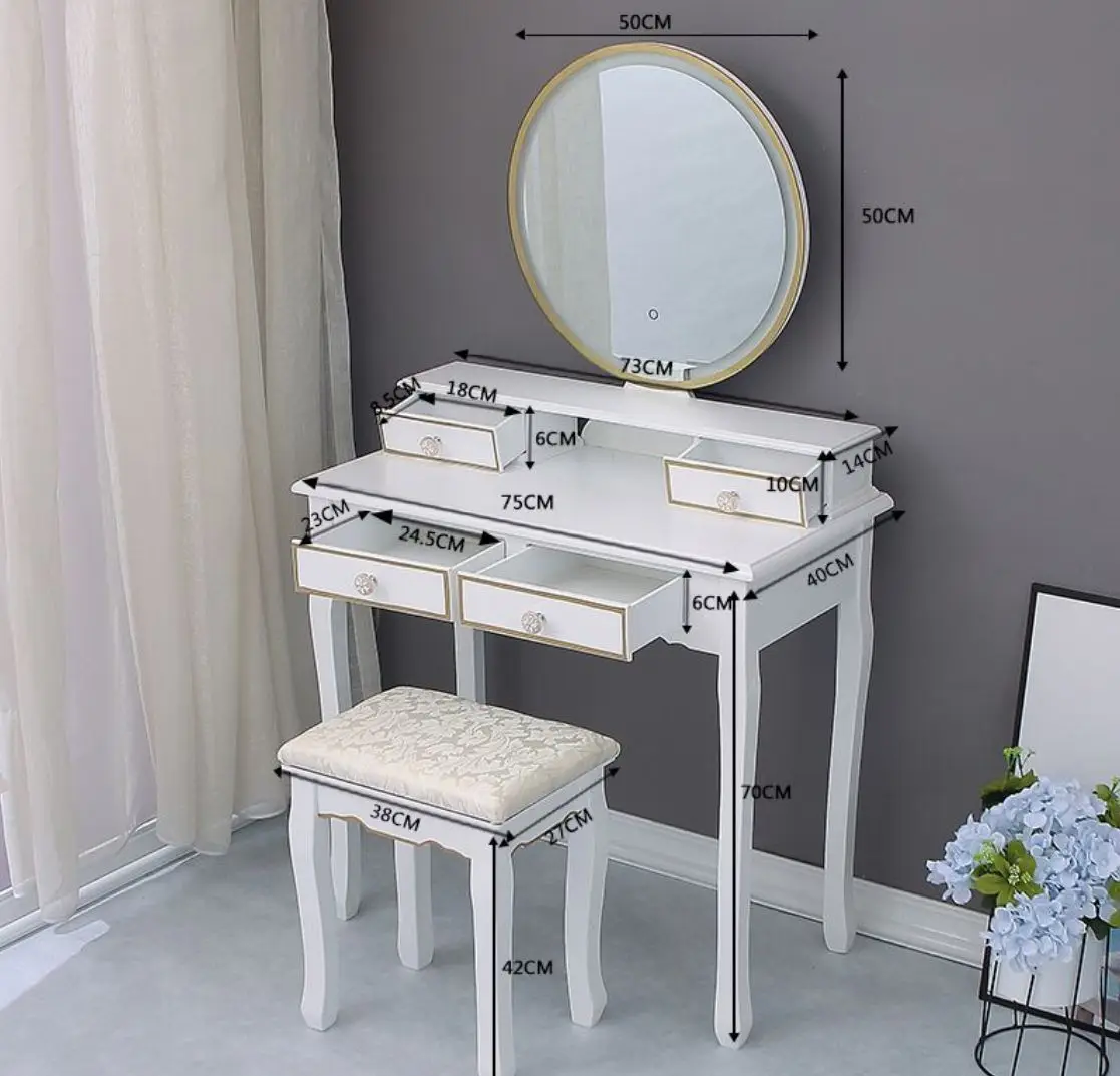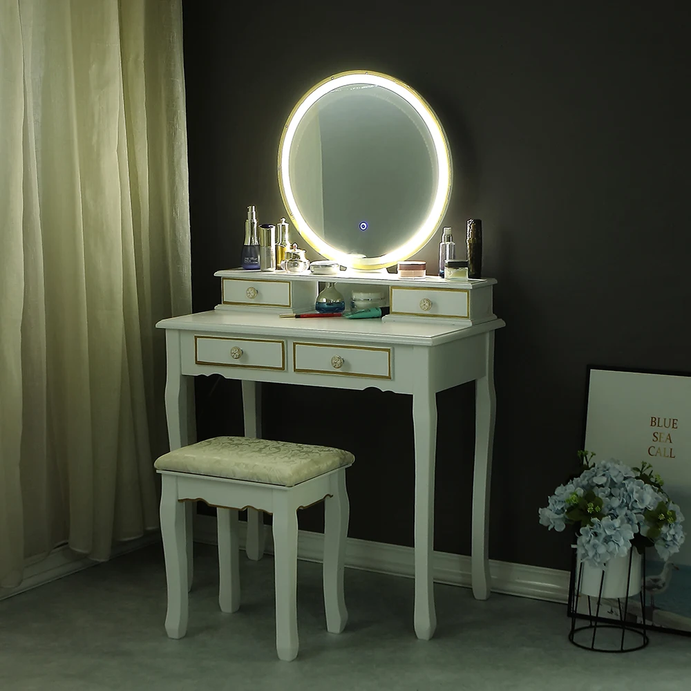 This Dressing Table is our latest designntroductions,This Dressing Table is our latest design. There are Design of lamp belt on Oval Mirror. Lighted Makeup Mirror with Natural 、 Bright Light and yellow light,with warm light / daylight /yellow light settings and adjustable brightness, the make up mirror provides a clean and bright reflection and allows you to get the most natural application of makeup, even at night.